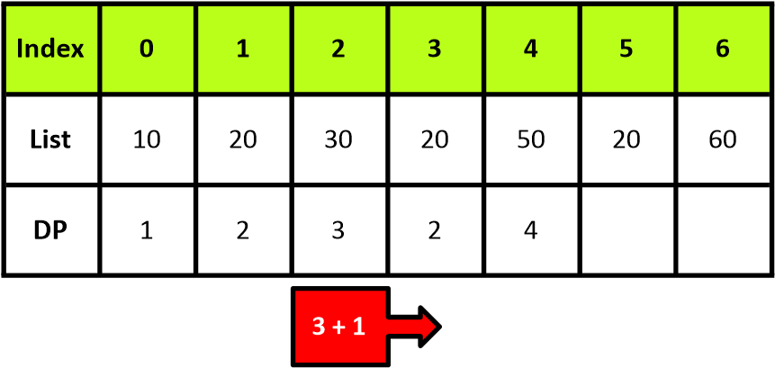 0부터 인덱스 4 전까지의 인덱스중 해당 수가 현재 인덱스(4)의 수보다 작을 경우 DP[4] = DP[index] + 1이다.