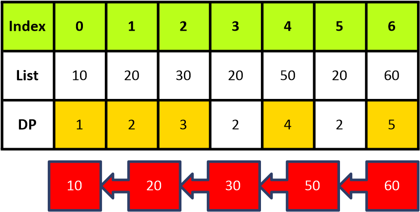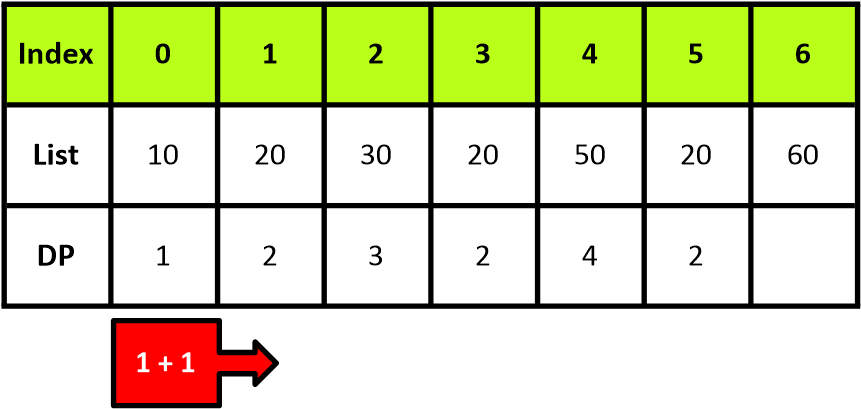 0부터 인덱스 6 전까지의 인덱스중 해당 수가 현재 인덱스(6)의 수보다 작을 경우 DP[6] = DP[index] + 1이다.
