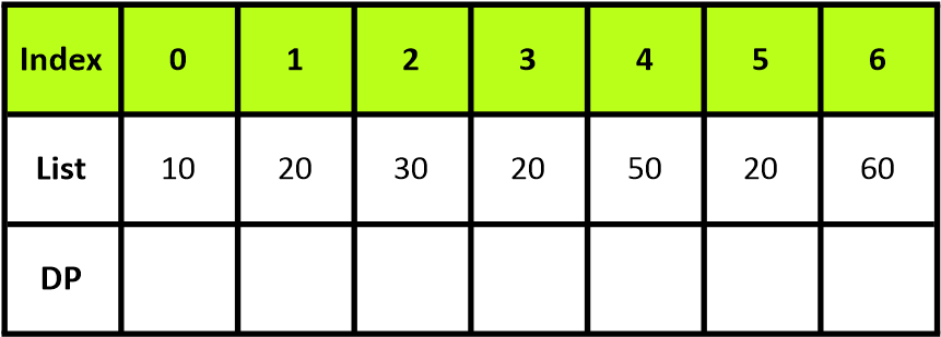Index는 헤딩 리스트의 인덱스 값을 나타내며, List에는 각 수열의 값을 보여준다. 마지막으로, DP에는 현재 인덱스 까지의 까지의 수열중 만들어질 수 있는 가장 긴 수열의 길이를 담아준다.