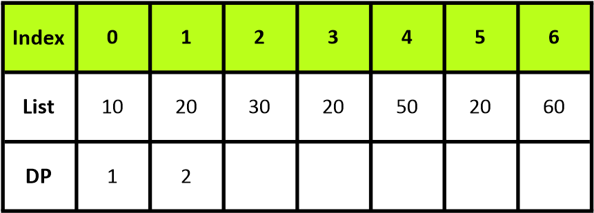0부터 인덱스 2 전까지의 인덱스중 해당 수가 현재 인덱스(2)의 수보다 작을 경우 DP[2] = DP[index] + 1이다.