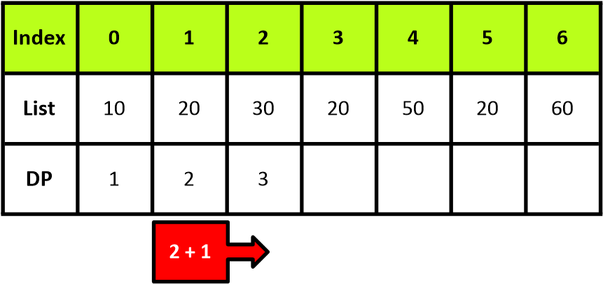 0부터 인덱스 3 전까지의 인덱스중 해당 수가 현재 인덱스(3)의 수보다 작을 경우 DP[3] = DP[index] + 1이다.