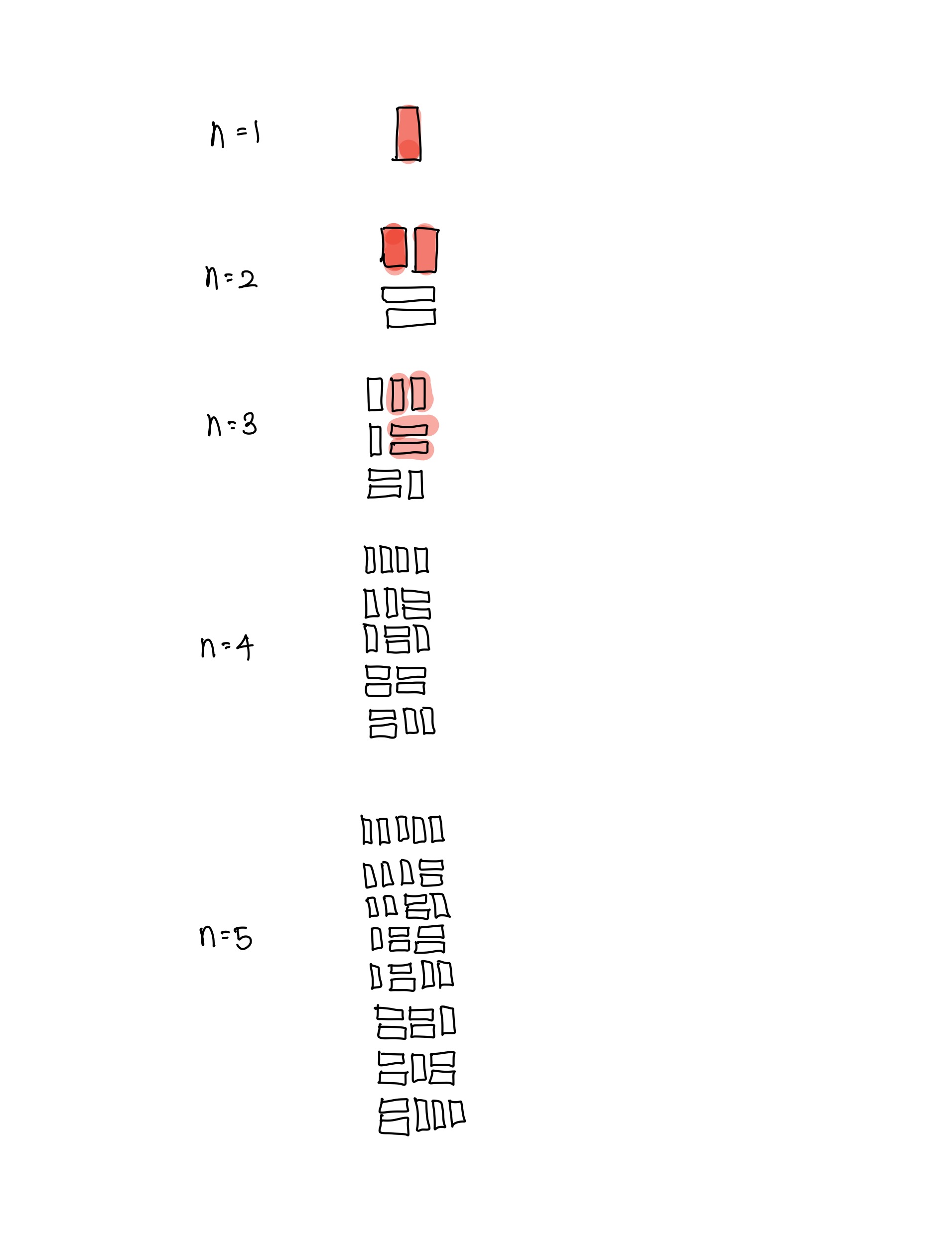 다음과 같이 n의 크기별로 구할 수 있는 도형들의 모양을 그리다보면 패턴이 보이기 시작한다.