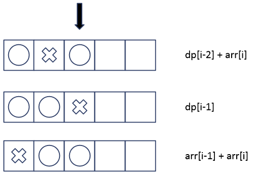 dp[i] = Math.max(Math.max((dp[i - 2] + arr[i]), (dp[i - 3] + arr[i - 1] + arr[i])), dp[i-1]);