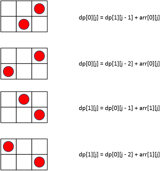 dp[1][j] = arr[1][j] + Math.max(dp[0][j - 1], dp[0][j - 2]);