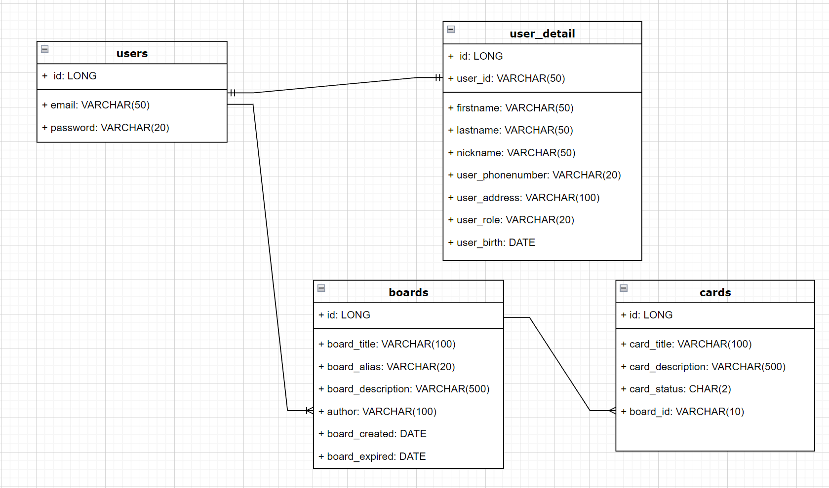 우선은 Users, UserDetail, Boards, Cards정도의 테이블을 설계할 것이고 이는 추후 계속적으로 업데이트 될 것이다.