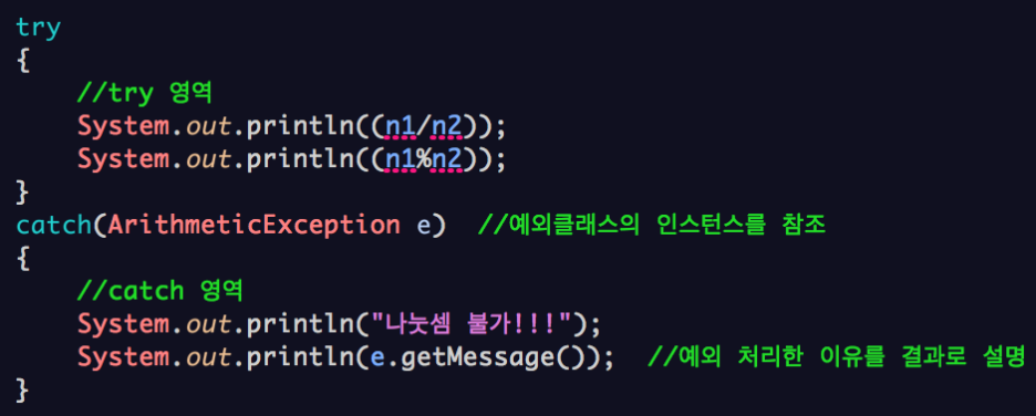 ArithmeticException e 는 예외클래스의 인스턴스를 참조한다는 뜻이고 예외가 발생하면 이 영역이 실행되어집니다.